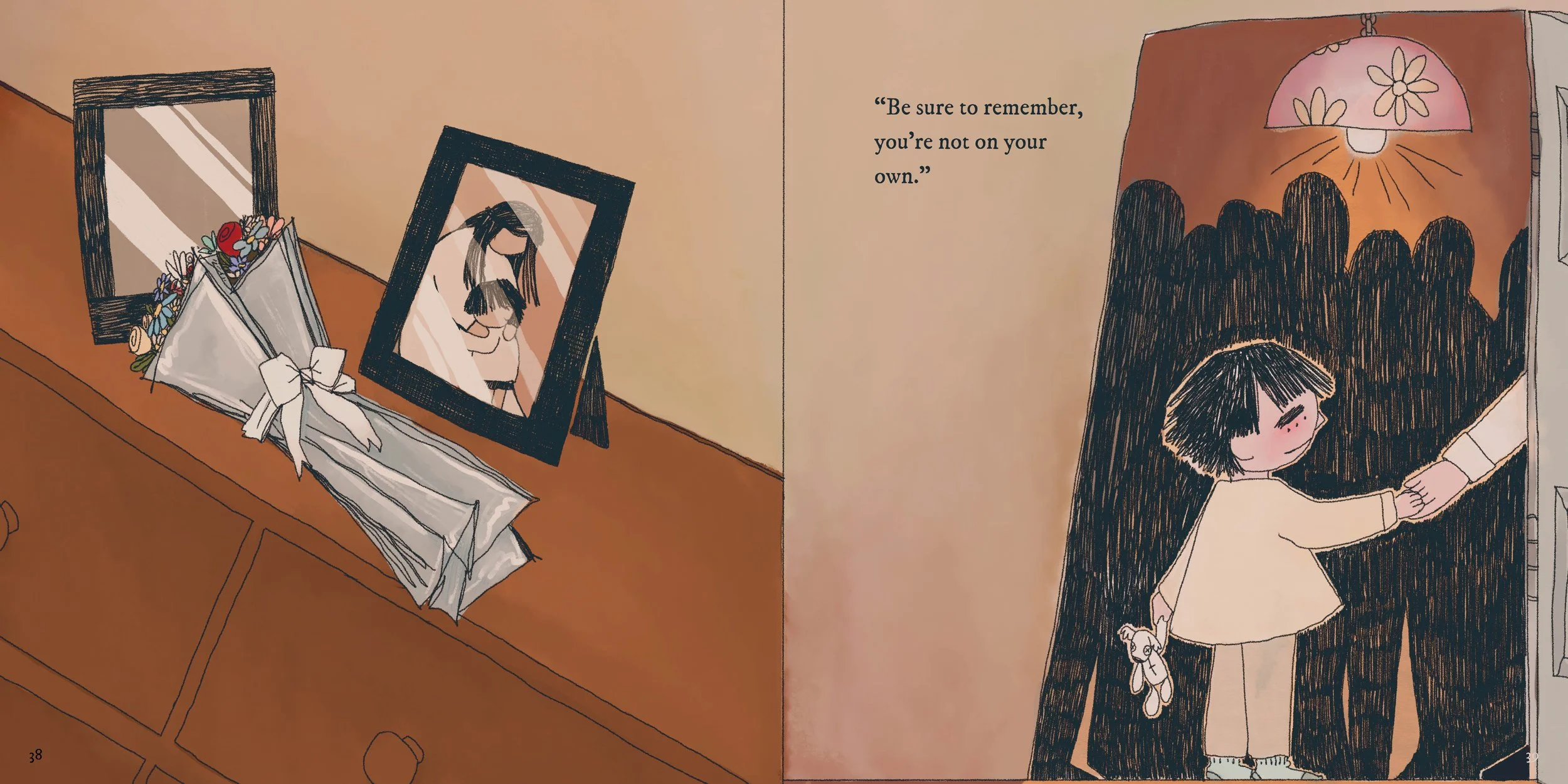 As the last spread of the book, I had to come up with a final conclusion to Noah's story. To ground the story in reality, I wanted to show Noah and the audience that there are people who love and comfort you when you need them. To show that he was not alone in this world, all by himself.